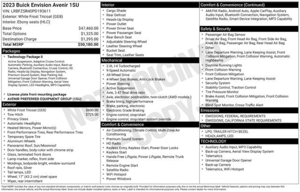 White Frost Tricoat 2023 Buick Envision Avenir AWD 4D Sport Utility 2.0L Turbocharged 22/29 City/Highway MPG