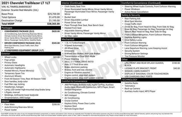 Scarlet Red Metallic 2021 Chevrolet TrailBlazer LT AWD 4D Sport Utility 1.3L Ecotec Turbo DOHC SIDI w/VVT 26/30 City/Highway MPG