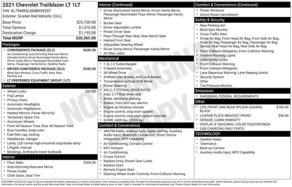 This Chevrolet TrailBlazer has great equipment and many features including, 1 Type-A & 1 Type-C USB Charging-Only Ports, 120-Volt Power Outlet, 8 Diagonal Color Touchscreen Display, Convenience Package, Driver & Front Passenger Illuminated Vanity Mirrors, Driver Confidence Package, Inside Rear-View Auto-Dimming Mirror, Lane Change Alert w/Side Blind Zone Alert, Preferred Equipment Group 1LT, Rear Cross Traffic Alert, Rear Park Assist, Single-Zone Auto Climate Control Air Conditioning, SiriusXM Radio.