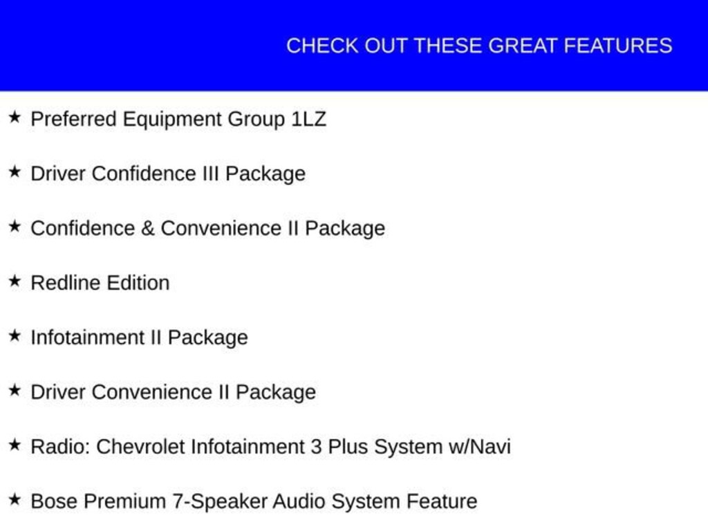 This Chevrolet Equinox has great equipment and many features including, Adaptive Cruise Control, Automatic Front & Rear Parking Assist, Bose Premium 7-Speaker Audio System Feature, Confidence & Convenience II Package, Driver Confidence III Package, Driver Convenience II Package, Front & Rear Black Bowtie Emblems, HD Surround Vision, Infotainment II Package, Preferred Equipment Group 1LZ, Radio: Chevrolet Infotainment 3 Plus System w/Navi, Redline Decals (LPO), Redline Edition, Wheels: 19 Aluminum (RZA).