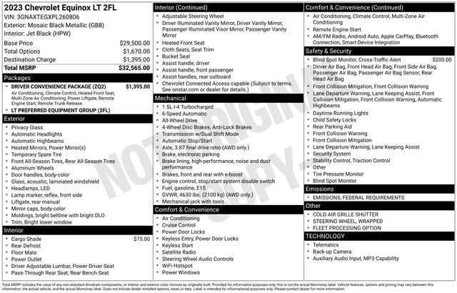 This Chevrolet Equinox has great equipment and many features including, Bluetooth® For Phone, Driver Convenience Package, Dual-Zone Automatic Climate Control, Front Bucket Seats, Heated Driver & Front Passenger Seats, Lane Change Alert w/Side Blind Zone Alert, Power windows, Preferred Equipment Group 2FL, Rear Cross Traffic Alert, Rear Power Liftgate, Remote keyless entry, Remote Start, Side Blind Zone & Rear Cross Traffic, Wrapped Steering Wheel.