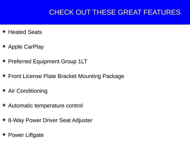 This Chevrolet Traverse has great equipment and many features including, Heated Seats, Apple CarPlay, 8-Way Power Driver Seat Adjuster, Air Conditioning, Automatic temperature control, Front License Plate Bracket Mounting Package, Garage door transmitter, Heated Driver & Front Passenger Seats, Illuminated entry, Leather steering wheel, Power Liftgate, Preferred Equipment Group 1LT.