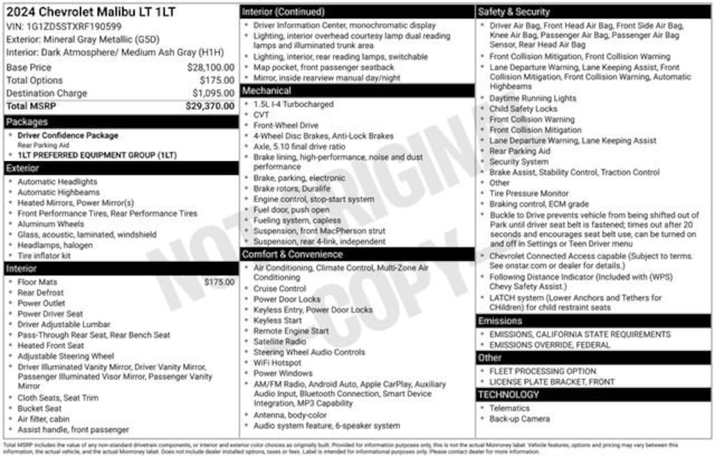 This Chevrolet Malibu has great equipment and many features including, 4-Wheel Disc Brakes, 6-Speaker Audio System Feature, Air Conditioning, Automatic temperature control, Delay-off headlights, Dual front impact airbags, Electronic Stability Control, Emergency communication system: OnStar and Chevrolet connected services capable, Preferred Equipment Group 1LT, Premium audio system: Chevrolet Infotainment 3 Plus, Radio: Chevrolet Infotainment 3 System, SiriusXM, Wireless Apple CarPlay/Android Auto.Mineral Gray Metallic 2024 Chevrolet Malibu LT 1LT FWD 4D Sedan 1.5L DOHC 28/36 City/Highway MPG Certified.Chevrolet Certified Pre-Owned Details:* 172 Point Inspection* Roadside Assistance* Vehicle History* Limited Warranty: 12 Month/12,000 Mile (whichever comes first) from certified purchase date* 24 months/24,000 miles (whichever comes first) Certified Pre-Owned Scheduled Maintenance Plan and 3 days/150 miles (whichever comes first) Vehicle Exchange Program. SiriusXM 3-month trial subscription.* Transferable Warranty* Powertrain Limited Warranty: 72 Month/100,000 Mile (whichever comes first) from original in-service date* Warranty Deductible: $0Come see why more people choose our Community!