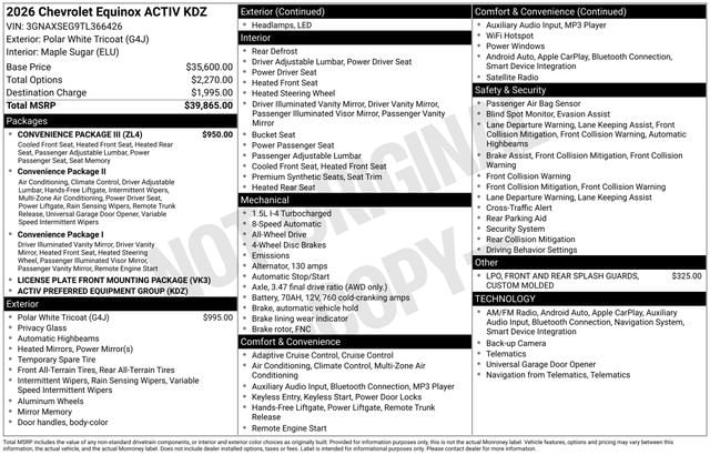 This exceptional 2026 Chevrolet Equinox ACTIV is a true testament to the brand's commitment to innovation and customer satisfaction. With its impressive performance, exceptional features, and uncompromising safety, it is the perfect SUV to elevate your driving experience. We invite you to visit our showroom and experience the Equinox ACTIV for yourself. Let us help you discover the perfect vehicle to meet your needs and exceed your expectations.