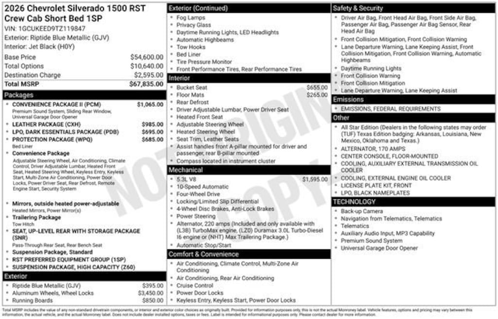 2026 Chevrolet Silverado 1500 RST 4WD 10-Speed Automatic EcoTec3 5.3L V8 Riptide Blue Metallic This Chevrolet Silverado 1500 has great equipment and many features including, 10-Way Power Driver Seat w/Lumbar, 12.3 Multicolor Reconfigurable Digital Display, 120-Volt Bed Mounted Power Outlet, 120-Volt Interior Power Outlet, 6-Speaker Audio System, All-Star Edition, Auto-Locking Rear Differential, Black Name Plates (LPO), Bluetooth® For Phone, Chevytec Spray-On Black Bedliner, Color-Keyed Carpeting Floor Covering, Convenience Package, Convenience Package II, Dark Essentials Package (LPO), Deep-Tinted Glass, Dual Rear USB Ports (Charge Only), Dual-Zone Automatic Climate Control, Electric Rear-Window Defogger, Electronic Cruise Control, EZ Lift Power Lock & Release Tailgate, Front Frame-Mounted Black Recovery Hooks, Front LED Fog Lamps, Front Rubberized Vinyl Floor Mats, HD Rear Vision Camera, Heated Driver & Front Outboard Passenger Seats, Heated Power-Adjustable Outside Mirrors, Heated Steering Wheel, High Capacity Suspension Package, High Gloss Black Mirror Caps, Hitch Guidance, Hitch Guidance w/Hitch View, In-Vehicle Trailering System App, Inside Rear-View Mirror w/Tilt, Integrated Trailer Brake Controller, Keyless Open & Start, Leather Package, Leather-Appointed Front Seat Trim, LED Cargo Area Lighting, Manual Tilt/Telescoping Steering Column, OnStar Services Capable, Power Front Windows w/Driver Express Up/Down, Power Front Windows w/Passenger Express Down, Power Rear Windows w/Express Down, Power Sliding Rear Window w/Rear Defogger, Preferred Equipment Group 1SP, Premium Bose 7-Speaker Sound System, Protection Package, Rear 60/40 Folding Bench Seat (Folds Up), Rear Rubberized-Vinyl Floor Mats, Rear Wheelhouse Liners, Remote Vehicle Starter System, SiriusXM w/360L Trial Subscription, Standard Tailgate, Steering Wheel Audio Controls, Teen Driver, Theft Deterrent System (Unauthorized Entry), Tire Pressure Monitoring System, Trailering Package, Universal Home Remote, Up-Level Rear Seat w/Storage Package, Wi-Fi Hot Spot Capable, Wrapped Steering Wheel.