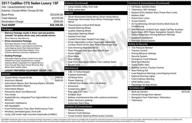 Crystal White Tricoat 2017 Cadillac CTS 2.0L Turbo Luxury AWD 4D Sedan 2.0L Turbo I4 DI DOHC VVT 21/29 City/Highway MPG