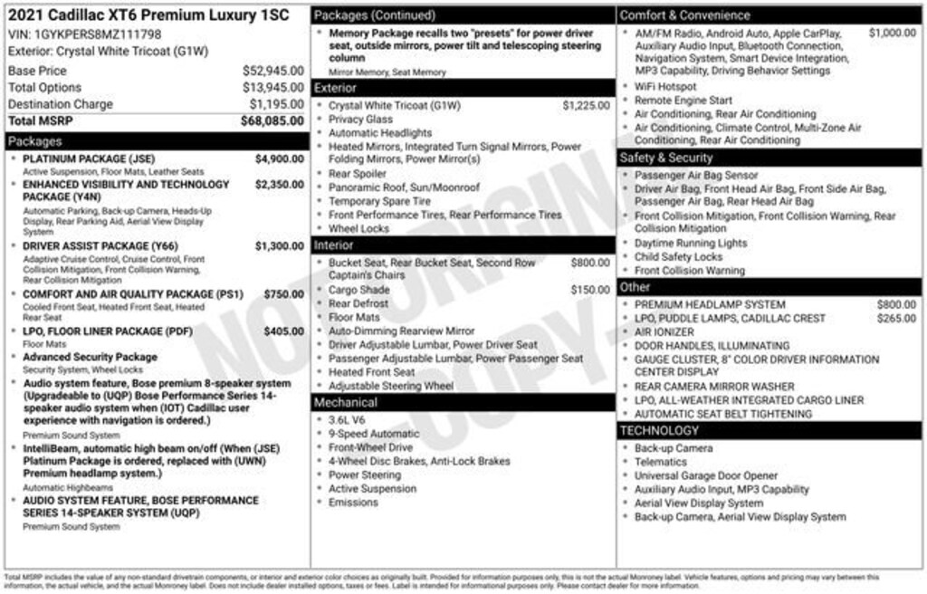 Crystal White Tricoat 2021 Cadillac XT6 Premium Luxury FWD 4D Sport Utility 3.6L V6 DI VVT 19/26 City/Highway MPG