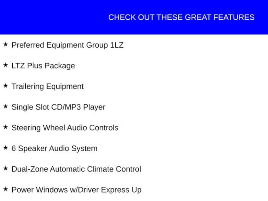 This Chevrolet Silverado 1500 has great equipment and many features including, 110-Volt AC Power Outlet, 150 Amp Alternator, 4.2 Diagonal Color Display Driver Info Center, 6 Speaker Audio System, Auto-Dimming Inside Rear-View Mirror, Auxiliary External Transmission Oil Cooler, Bluetooth® For Phone, Chrome Bodyside Moldings, Chrome Cap Power-Adjustable Heated Outside Mirrors, Chrome Door Handles, Chrome Grille w/Chrome Surround, Chrome Mirror Caps, Color-Keyed Carpeting w/Rubberized Vinyl Floor Mats, Deep-Tinted Glass, Driver & Front Passenger Illuminated Vanity Mirrors, Dual-Zone Automatic Climate Control, EZ Lift & Lower Tailgate, Front Chrome Bumper, Front Halogen Fog Lamps, Heavy-Duty Rear Locking Differential, Leather Wrapped Heated Steering Wheel, Leather Wrapped Steering Wheel w/Cruise Controls, LTZ Plus Package, Manual Tilt Wheel Steering Column, OnStar 6 Months Directions & Connections Plan, Power Adjustable Pedals, Power Sliding Rear Window, Power Windows w/Driver Express Up, Preferred Equipment Group 1LZ, Rear 60/40 Folding Bench Seat (Folds Up), Rear Chrome Bumper, Rear Vision Camera w/Dynamic Guide Lines, Rear Wheelhouse Liners, Remote Keyless Entry, Remote Vehicle Starter System, Single Slot CD/MP3 Player, Steering Wheel Audio Controls, Theft Deterrent System (Unauthorized Entry), Trailering Equipment, Universal Home Remote.