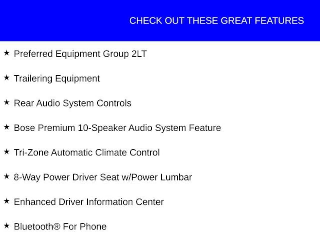 This Chevrolet Traverse has great equipment and many features including, 8-Way Power Driver Seat w/Power Lumbar, Auto-Dimming Inside Rear-View Mirror, Bluetooth® For Phone, Body-Color Bodyside Moldings, Bose Premium 10-Speaker Audio System Feature, Enhanced Driver Information Center, Front Fog Lamps, Front Row Side-Impact Air Bags, Heated Driver & Front Passenger Seats, Heated Power-Adjustable Body-Color Outside Mirrors, Heavy-Duty Cooling System, Interior Wood Grain Center Stack & Interior Trim, Leather-Wrapped Steering Wheel, Preferred Equipment Group 2LT, Rear Audio System Controls, Rear Park Assist, Rear Power Liftgate, Remote Vehicle Start, Trailer Hitch, Trailering Equipment, Tri-Zone Automatic Climate Control, Universal Home Remote.