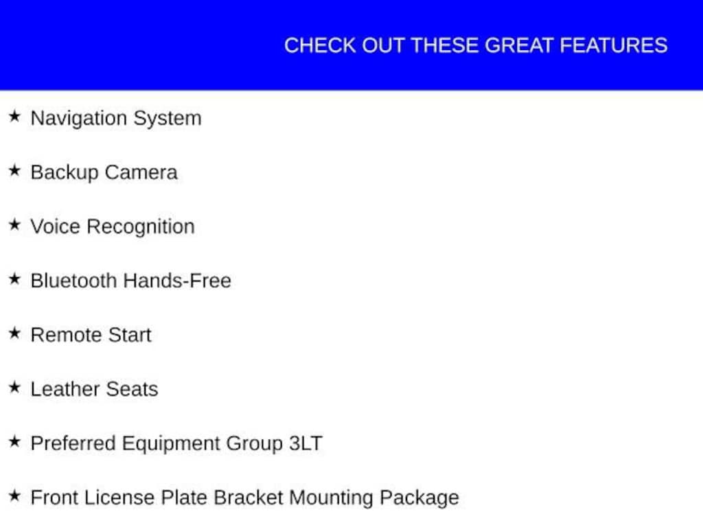This Chevrolet Traverse has great equipment and many features including, Navigation System, Backup Camera, Voice Recognition, Bluetooth Hands-Free, Remote Start, Leather Seats, Front License Plate Bracket Mounting Package, Preferred Equipment Group 3LT.