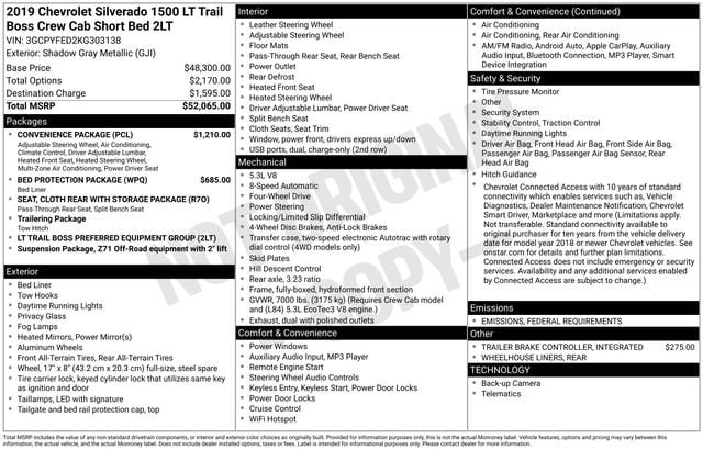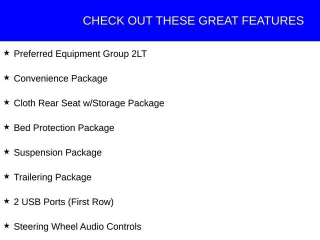 This Chevrolet Silverado 1500 has great equipment and many features including, 10-Way Power Driver Seat w/Lumbar, 12-Volt Rear Auxiliary Power Outlet, 170 Amp Alternator, 2 USB Ports (First Row), 4-Way Manual Driver Seat Adjuster, 4.2 Diagonal Color Display Driver Info Center, 6-Speaker Audio System, All-Weather Floor Liner (LPO) (AAK), Auxiliary External Transmission Oil Cooler, Bed Protection Package, Bluetooth® For Phone, Chevytec Spray-On Black Bedliner, Cloth Rear Seat w/Storage Package, Color-Keyed Carpeting Floor Covering, Compass, Convenience Package, Deep-Tinted Glass, Dual Exhaust w/Polished Outlets, Dual-Zone Automatic Climate Control, Electric Rear-Window Defogger, Electrical Lock Control Steering Column, Electronic Cruise Control, Front LED Fog Lamps, Heated Driver & Front Passenger Seats, Heated Steering Wheel, Heavy-Duty Rear Locking Differential, High Gloss Black Grille, High Gloss Black Mirror Caps, Hitch Guidance, Keyless Open & Start, Leather Wrapped Steering Wheel, LED Cargo Area Lighting, Manual Tilt Wheel Steering Column, Manual Tilt/Telescoping Steering Column, OnStar & Chevrolet Connected Services Capable, Performance Red Recovery Hooks, Power Door Locks, Power Front Windows w/Driver Express Up/Down, Power Front Windows w/Passenger Express Down, Power Rear Windows w/Express Down, Preferred Equipment Group 2LT, Rear 60/40 Folding Bench Seat (Folds Up), Rear Dual USB Charging-Only Ports, Rear Vision Camera, Rear Wheelhouse Liners, Remote Vehicle Starter System, Single-Zone Manual/Semi-Automatic Air Conditioning, Steering Wheel Audio Controls, Suspension Package, Theft Deterrent System (Unauthorized Entry), Trailering Package.