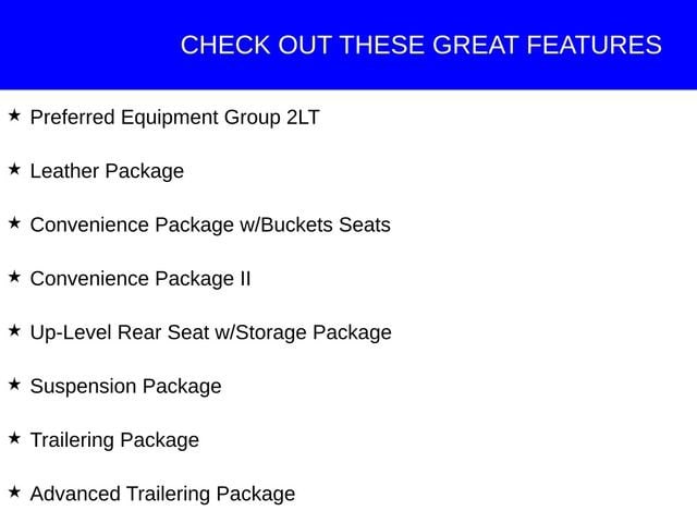 This Chevrolet Silverado 1500 has great equipment and many features including, 10-Way Power Driver Seat w/Lumbar, 12-Volt Rear Auxiliary Power Outlet, 120-Volt Instrument Panel Power Outlet, 170 Amps Alternator, 2 USB Ports, 2 USB Ports (First Row), 4-Way Manual Driver Seat Adjuster, 4.2 Diagonal Color Display Driver Info Center, 6-Speaker Audio System, Advanced Trailering Package, Advanced Trailering System, All-Weather Floor Liner (LPO) (AAK), Auxiliary External Transmission Oil Cooler, Bluetooth® For Phone, Color-Keyed Carpeting Floor Covering, Compass, Convenience Package II, Convenience Package w/Buckets Seats, Deep-Tinted Glass, Dual Exhaust w/Polished Outlets, Dual-Zone Automatic Climate Control, Electric Rear-Window Defogger, Electrical Lock Control Steering Column, Floor Mounted Center Console, Front Bucket Seats, Front LED Fog Lamps, HD Radio, HD Rear Vision Camera, Heated Driver & Front Outboard Passenger Seats, Heated Steering Wheel, Heavy-Duty Rear Locking Differential, High Gloss Black Grille, High Gloss Black Mirror Caps, Hitch Guidance, Hitch Guidance w/Hitch View, Integrated Trailer Brake Controller, Keyless Open & Start, Leather Package, Leather Wrapped Steering Wheel, LED Cargo Area Lighting, LED Reflector Headlamps, Manual Tilt-Wheel Steering Column, Manual Tilt/Telescoping Steering Column, OnStar & Chevrolet Connected Services Capable, Perforated Leather-Appointed Front Seat Trim, Performance Red Recovery Hooks, Power Door Locks, Power Front Windows w/Driver Express Up/Down, Power Front Windows w/Passenger Express Down, Power Rear Windows w/Express Down, Power Sliding Rear Window w/Rear Defogger, Preferred Equipment Group 2LT, Premium Bose 7-Speaker Sound System, Radio: Chevrolet Infotainment 3 Plus System, Rear 60/40 Folding Bench Seat (Folds Up), Rear Dual USB Charging-Only Ports, Rear Vision Camera, Remote Vehicle Starter System, Single-Zone Manual/Semi-Automatic Air Conditioning, SiriusXM w/360L, Steering Wheel Audio Controls, Steering Wheel Mounted Electronic Cruise Control, Suspension Package, Theft Deterrent System (Unauthorized Entry), Trailering Package, Universal Home Remote, Up-Level Rear Seat w/Storage Package.
