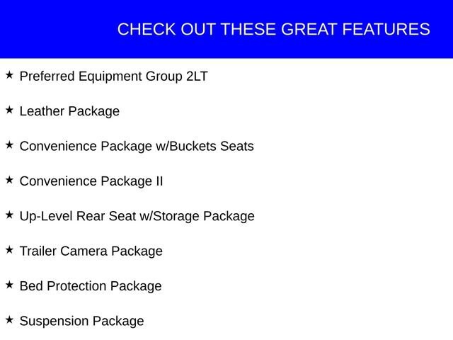 This Chevrolet Silverado 1500 has great equipment and many features including, 10-Way Power Driver Seat w/Lumbar, 12-Volt Rear Auxiliary Power Outlet, 120-Volt Instrument Panel Power Outlet, 170 Amps Alternator, 2 USB Ports, 2 USB Ports (First Row), 4-Way Manual Driver Seat Adjuster, 4.2 Diagonal Color Display Driver Info Center, 6-Speaker Audio System, Advanced Trailering Package, Advanced Trailering System, All-Weather Floor Liner (LPO) (AAK), Auxiliary External Transmission Oil Cooler, Bed Protection Package, Bed View Camera, Bluetooth® For Phone, Chevytec Spray-On Black Bedliner, Color-Keyed Carpeting Floor Covering, Compass, Convenience Package II, Convenience Package w/Buckets Seats, Deep-Tinted Glass, Dual Exhaust w/Polished Outlets, Dual-Zone Automatic Climate Control, Electric Rear-Window Defogger, Electrical Lock Control Steering Column, Floor Mounted Center Console, Front Bucket Seats, Front LED Fog Lamps, HD Radio, HD Rear Vision Camera, Heated Driver & Front Outboard Passenger Seats, Heated Steering Wheel, Heavy-Duty Rear Locking Differential, High Gloss Black Grille, High Gloss Black Mirror Caps, Hitch Guidance, Hitch Guidance w/Hitch View, Integrated Trailer Brake Controller, Keyless Open & Start, Leather Package, Leather Wrapped Steering Wheel, LED Cargo Area Lighting, LED Reflector Headlamps, Manual Tilt-Wheel Steering Column, Manual Tilt/Telescoping Steering Column, OnStar & Chevrolet Connected Services Capable, Perforated Leather-Appointed Front Seat Trim, Performance Red Recovery Hooks, Power Door Locks, Power Front Windows w/Driver Express Up/Down, Power Front Windows w/Passenger Express Down, Power Rear Windows w/Express Down, Power Sliding Rear Window w/Rear Defogger, Preferred Equipment Group 2LT, Premium Bose 7-Speaker Sound System, Radio: Chevrolet Infotainment 3 Plus System, Rear 60/40 Folding Bench Seat (Folds Up), Rear Dual USB Charging-Only Ports, Rear Vision Camera, Rear Wheelhouse Liners, Remote Vehicle Starter System, Single-Zone Manual/Semi-Automatic Air Conditioning, SiriusXM w/360L, Steering Wheel Audio Controls, Steering Wheel Mounted Electronic Cruise Control, Suspension Package, Theft Deterrent System (Unauthorized Entry), Trailer Camera Package, Trailering Package, Universal Home Remote, Up-Level Rear Seat w/Storage Package.