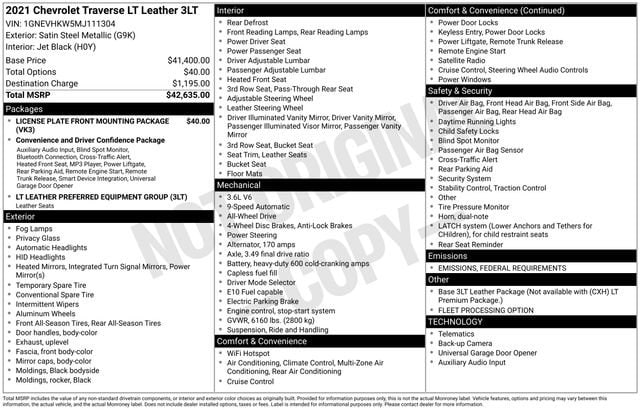 With its impressive 17 city and 25 highway MPG ratings, the 2021 Chevrolet Traverse LT Leather offers the perfect blend of power, efficiency, and practicality. Whether you're embarking on a family road trip, transporting your team, or simply running errands, this versatile SUV is up for the task.