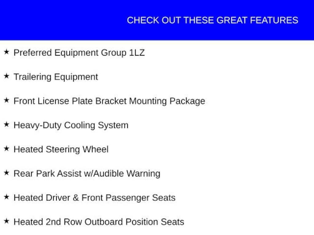 This Chevrolet Traverse has great equipment and many features including, Front License Plate Bracket Mounting Package, Heated 2nd Row Outboard Position Seats, Heated Driver & Front Passenger Seats, Heated Steering Wheel, Heavy-Duty Cooling System, Hitch Guidance w/Hitch View, Preferred Equipment Group 1LZ, Rear Park Assist w/Audible Warning, Trailering Assist Guidelines, Trailering Equipment, Ventilated Driver & Front Passenger Seats.