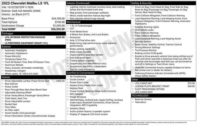 Dark Ash Metallic 2023 Chevrolet Malibu LS 1FL FWD 4D Sedan 1.5L DOHC 27/35 City/Highway MPG