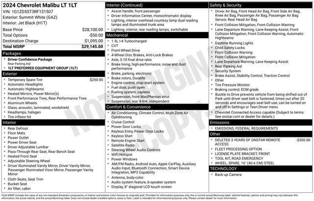 Summit White 2024 Chevrolet Malibu LT 1LT FWD 4D Sedan 1.5L DOHC 28/36 City/Highway MPG