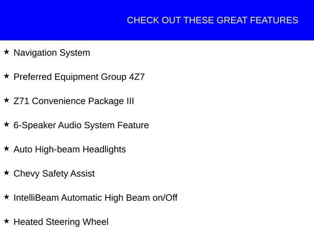 This Chevrolet Colorado has great equipment and many features including, 6-Speaker Audio System Feature, Apple CarPlay/Android Auto, Auto High-beam Headlights, Chevy Safety Assist, Driver and Front Passenger Ventilated Seats, Driver Memory Settings, Driver Seatback Map Pocket, Heated Steering Wheel, IntelliBeam Automatic High Beam on/Off, Navigation System, Outside temperature display, Perforated Leather-Appointed Seat Trim, Preferred Equipment Group 4Z7, Rear Center Armrest, Z71 Convenience Package III.