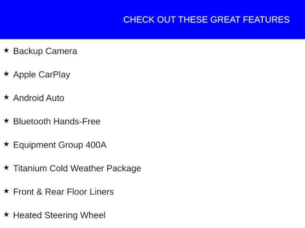 This Ford EcoSport has great equipment and many features including, Backup Camera, Apple CarPlay, Android Auto, Bluetooth Hands-Free, Equipment Group 400A, Front & Rear Floor Liners, Heated Steering Wheel, SYNC Connect, Titanium Cold Weather Package, Windshield Wiper De-Icer.