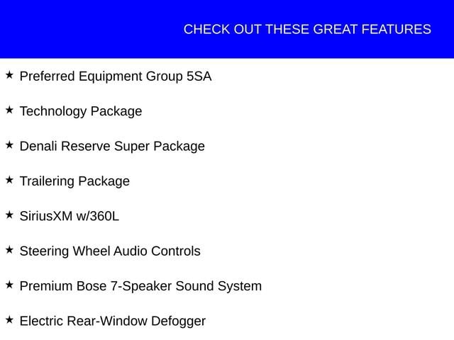 Comfort and luxury abound in the Denali's cabin, with heated and ventilated front seats, a heated steering wheel, and heated rear outboard seats. The spacious interior, along with the power-sliding rear window and premium floor liners, ensures a refined and versatile driving experience, whether you're hauling cargo or enjoying a long road trip.