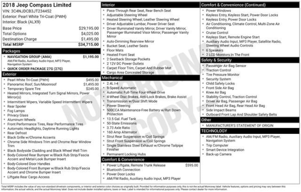 Pearl White Tri-Coat 2018 Jeep Compass Limited 4WD 4D Sport Utility 2.4L I4 22/30 City/Highway MPG