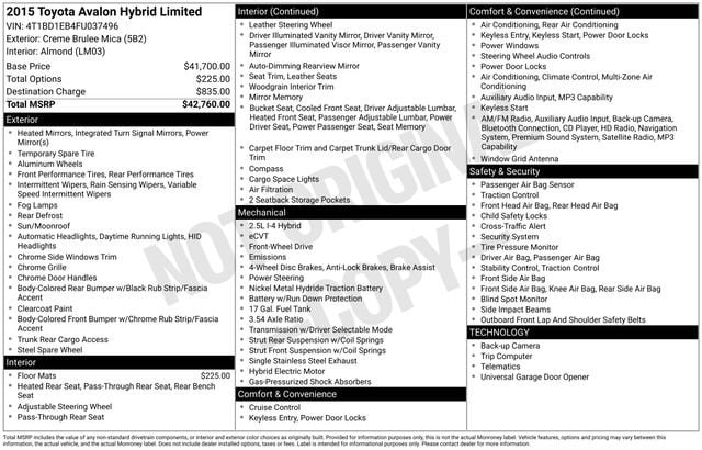Creme Brulee 2015 Toyota Avalon Hybrid Limited FWD 4D Sedan 2.5L 4-Cylinder Atkinson-Cycle DOHC 16V 40/39 City/Highway MPG